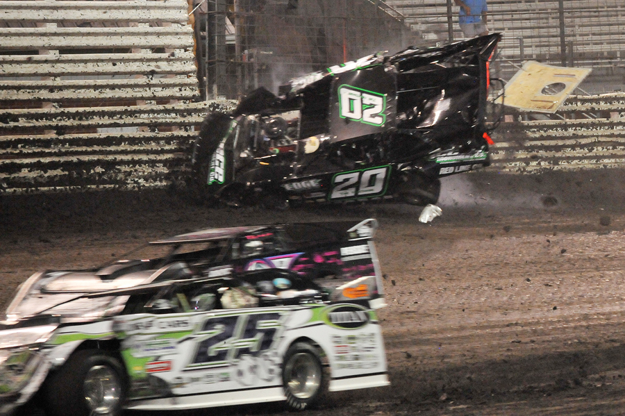 Jimmy Owens goes for a scary ride at Knoxville (IA) Raceway during the 'Lucas Oil Late Model Knoxville Nationals' - Jeff Bylsma Photo