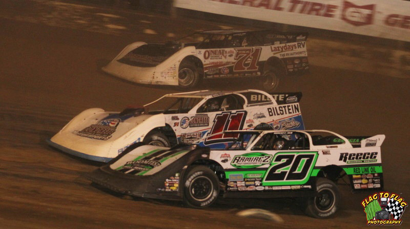 Jimmy Owens races three-wide during the 2021 'Dirt Track World Championship' at PRP - Flag to Flag Photography